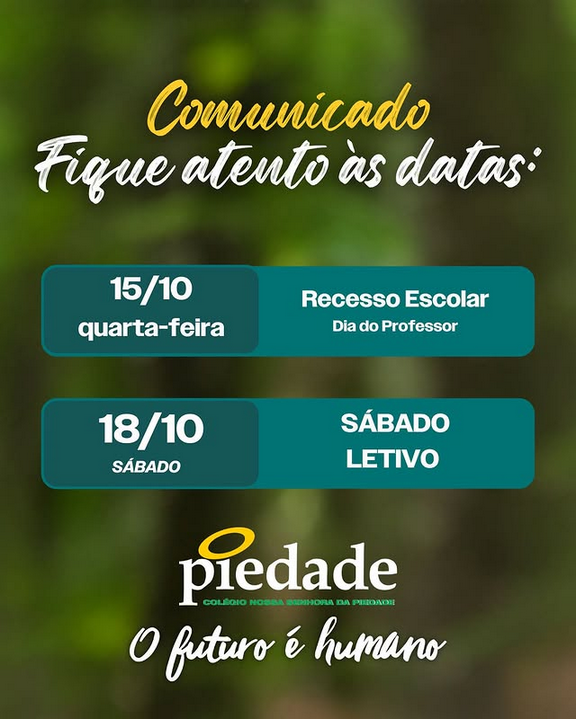 Conforme nosso calendário acadêmico, disponível em nosso site e no sistema acadêmico, informamos datas importantes do Colégio Piedade: