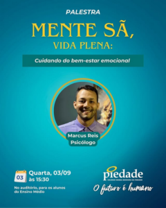 Na próxima quarta-feira, 03/09, às 15h30, receberemos no auditório do Colégio Piedade o psicólogo Marcus Reis, com a palestra: