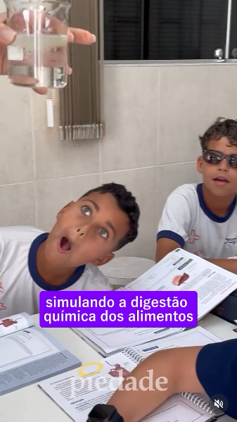 Com a orientação das professoras Dani e Cláudia, eles realizaram uma simulação da digestão química dos alimentos, usando água, óleo e detergente para compreender como a bile atua na quebra das moléculas de gordura no nosso organismo.