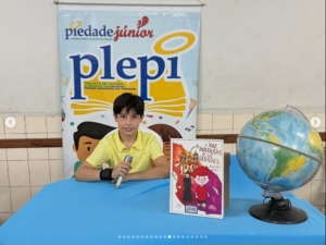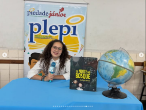 Os alunos tiveram a missão de se transformar em jornalistas literários por um dia, apresentando três notícias inspiradas no livro que leram. 📚🗞️